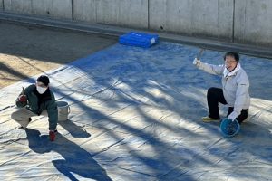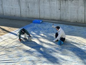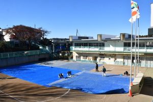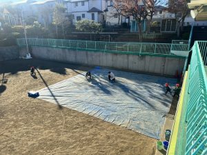園庭には、 霜よけ対策のブルーシートが敷き詰められました。