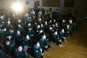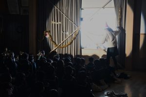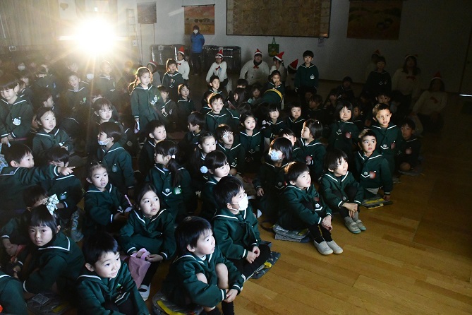 【注】 会場内はもっと暗いのですが、 この画像は あえて明るく加工してあります。 子どもたちの見つめる先に現れたのは・・・・・
