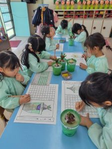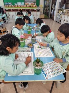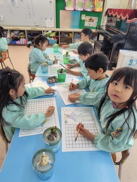 年長さんは、 二日間にわたって ヒヤシンスの観察画に取り組みました。