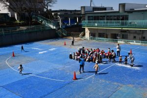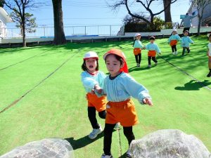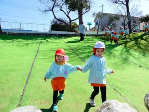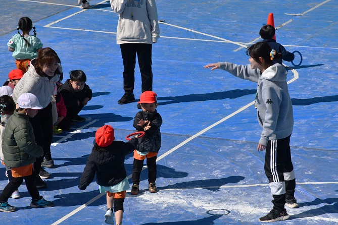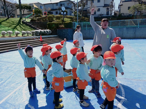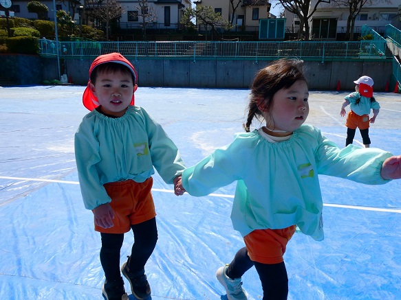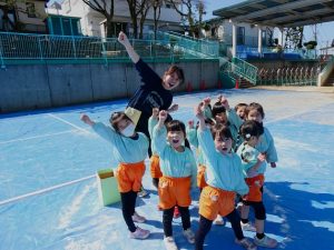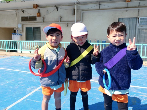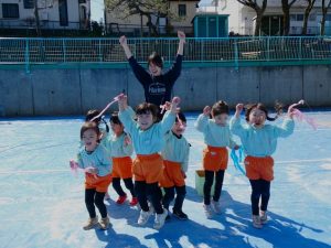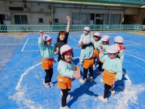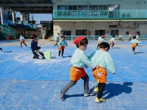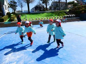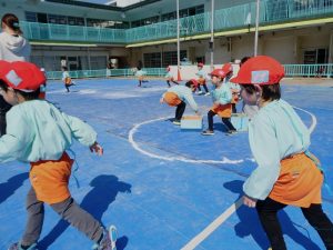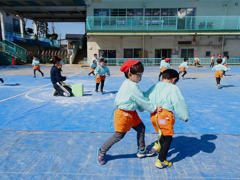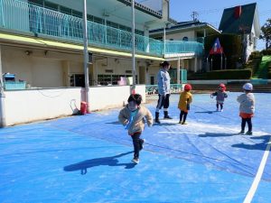 また、 年少さんは 園庭で リレー、しっぽとり、 ドロケイの なんと3本立てメニューを楽しみました。