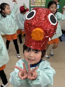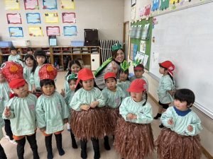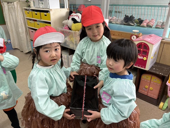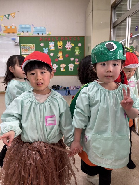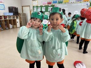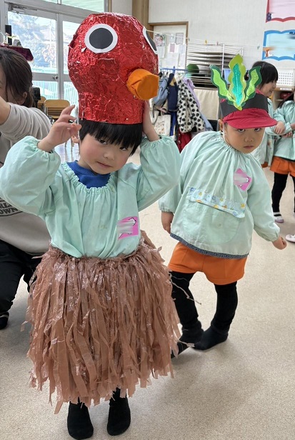 実際に舞台で使用したものを着けて、 満足そうにしている年少さんが可愛いですね。