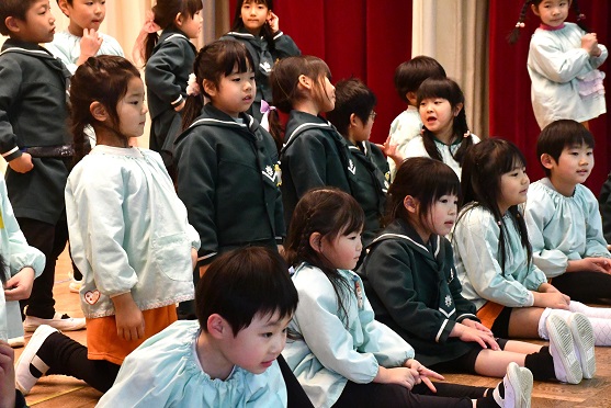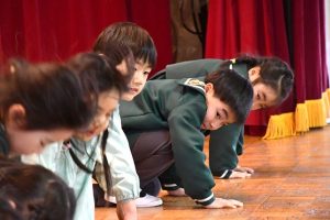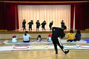曲や先生の考えた踊りの振り付けを楽しみ、 舞台で表現する喜びを感じながらの演技でした。 2回行った練習のうち、 最後の練習は カメラを置いて ステージの子供たちの踊りを じっくりと眺めました。