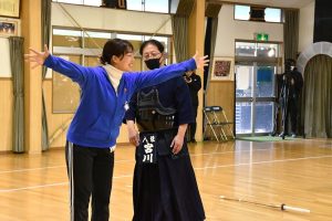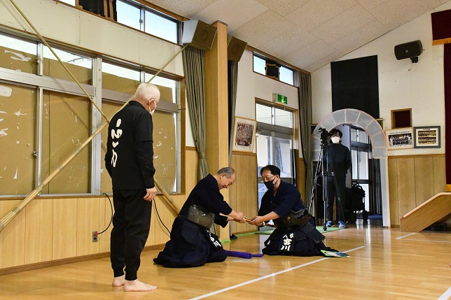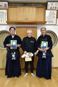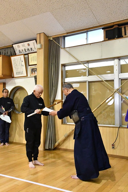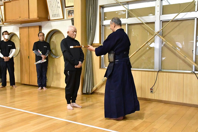 石川先生から、 退職が決まった 西山先生に 竹刀の贈呈がありました。