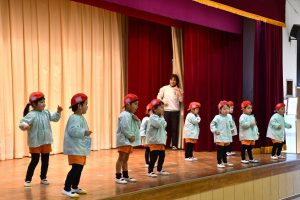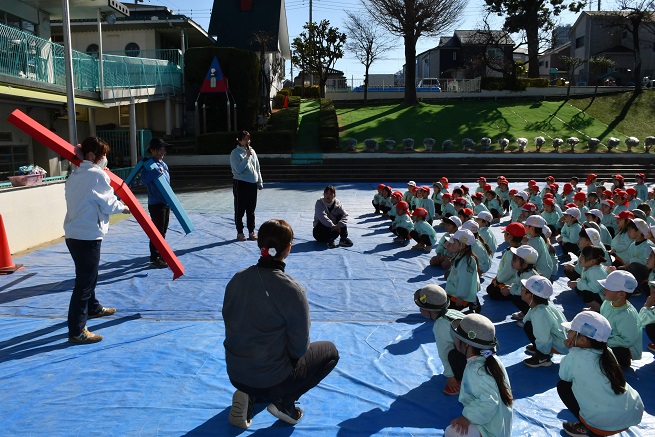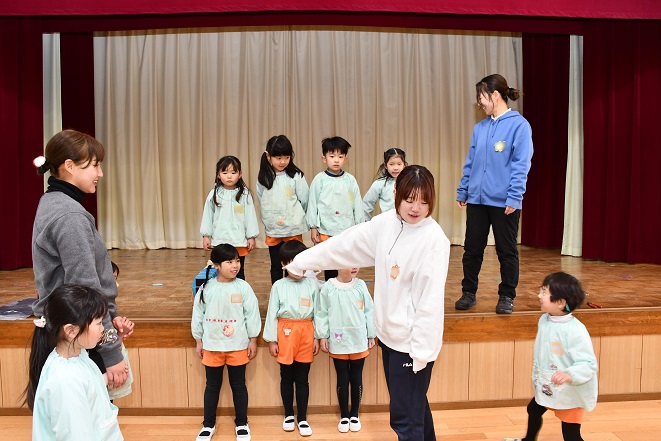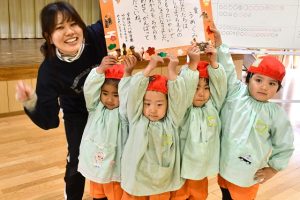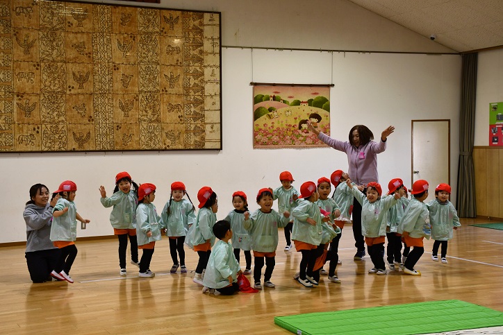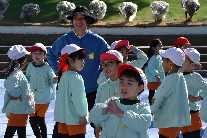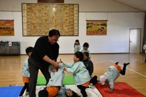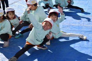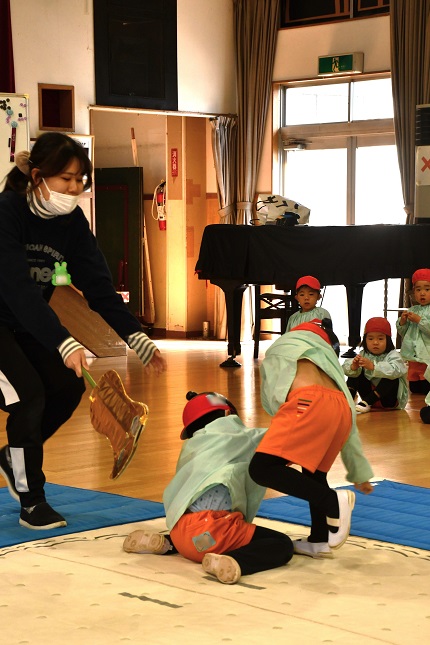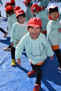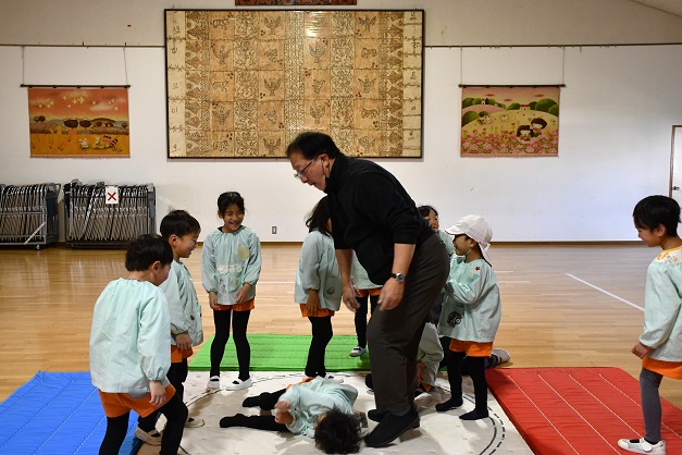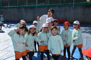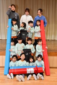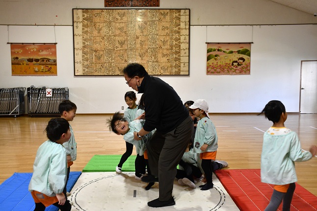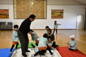 卒園記念品撮影の前に、 筆者に挑む年長さんたち。