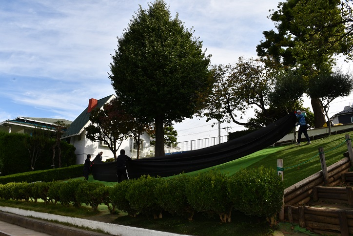 芝の斜面では、 男性職員チームが総出で 「 スカイ・ハイ 」 の取り外し作業を行いました。