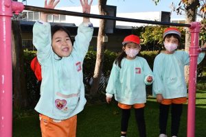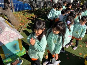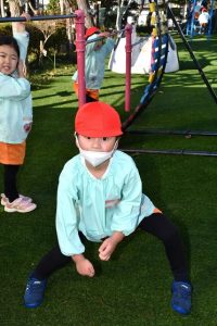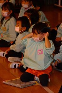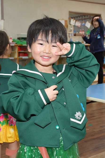 本日のトップバッター 年少〇〇組さんも、 衣装を着けているところでした。