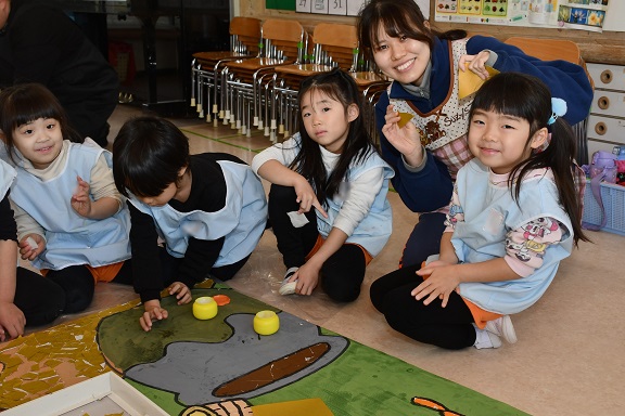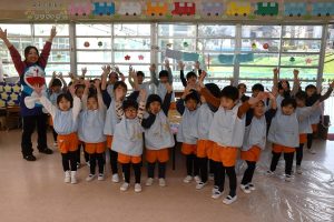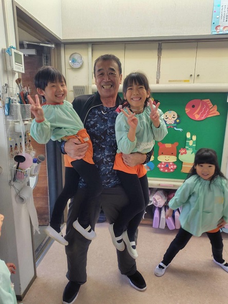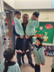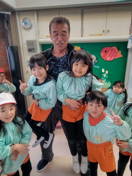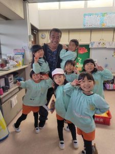 子どもたちにも 先生たちにも大人気の〇〇〇〇先生は、 昼食時には 順番に各保育室を訪問して 子どもたちと一緒に食事をしています。