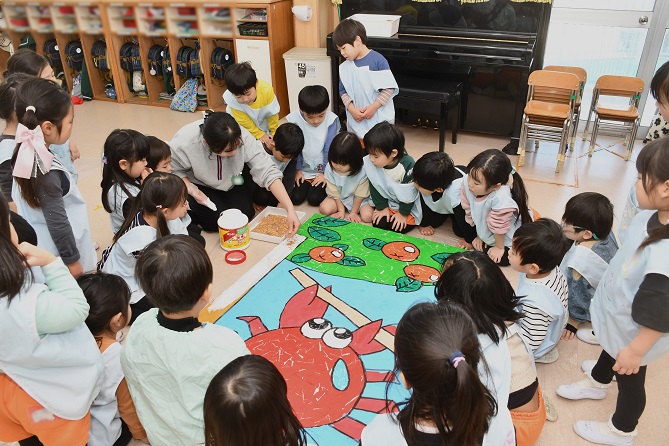 作品を囲んで 万歳する 先生と子供たち。