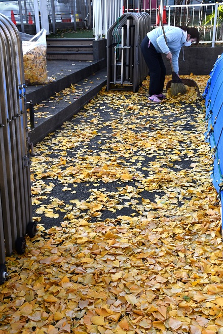 今朝は、先生たちが イチョウやモミジの落ち葉を丁寧にかき集めました。