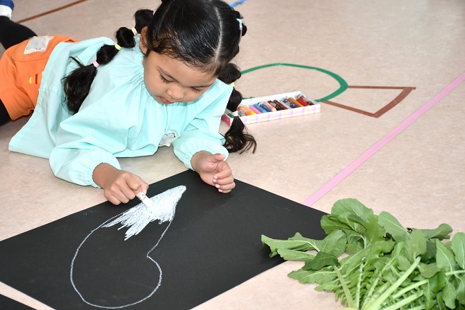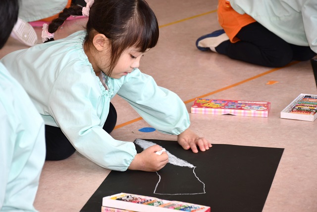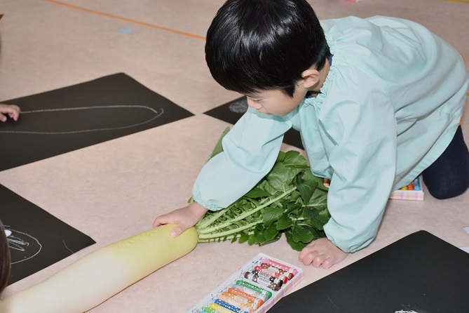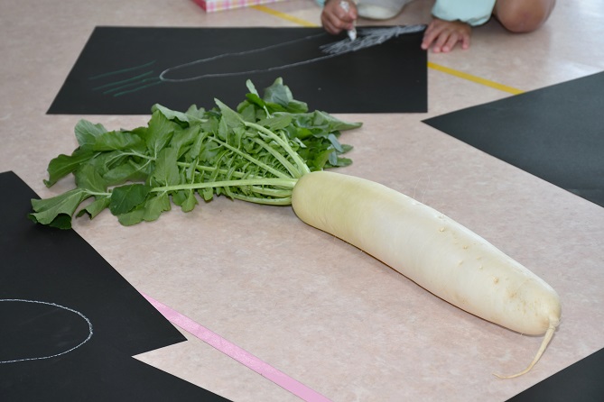 大根は、 画用紙の黒い部分が見えなくなるまで、 しっかり塗りつぶすのがポイントです。