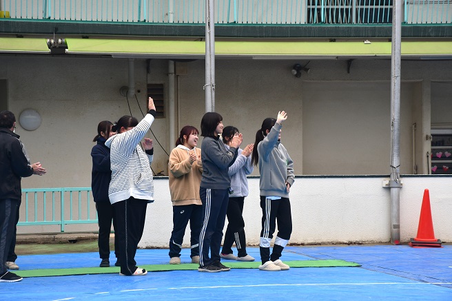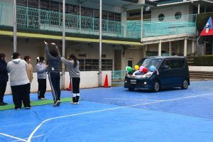 先生たちが、 笑顔で その車に手を振り 拍手を送っています。