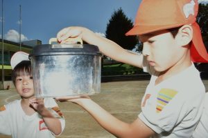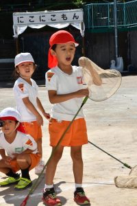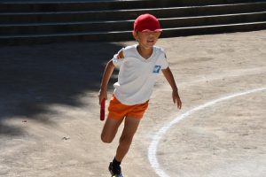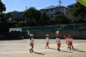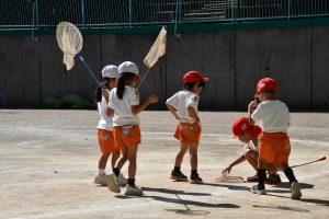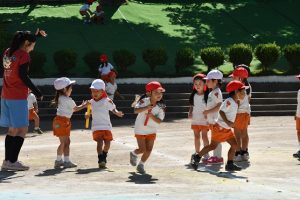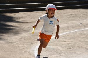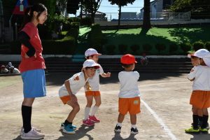 過ごしやすくなってきた園庭で、 リレー遊びをする子供たち。