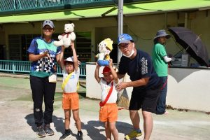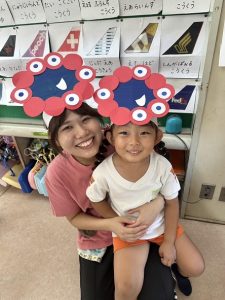 ミャクミャクを頭につけた 〇〇ちゃんと〇〇先生。