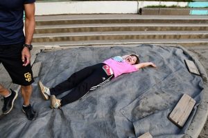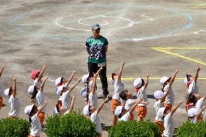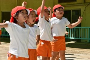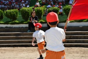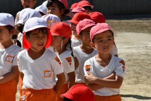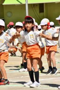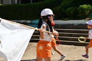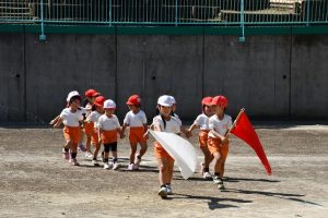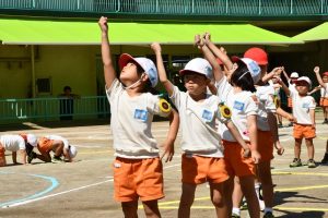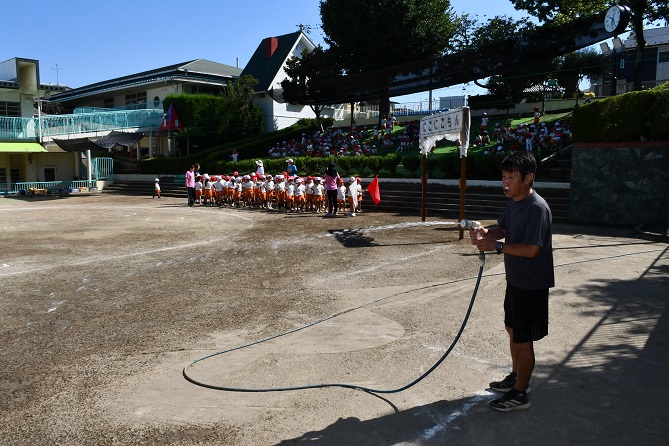 きょうは、 乾燥する園庭に お水を撒きながら、 一部 運動会練習を行いました。